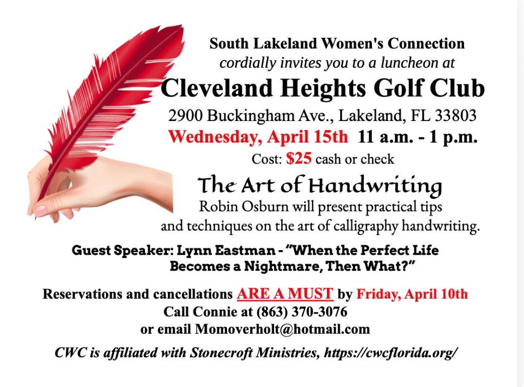 Lakeland South Christian Women’s Connection cordially invites you and your friends to our Monthly Luncheons held on the 3rd Wednesday of every month at the Cleveland Heights Golf Club from 11-1. Price is $25.